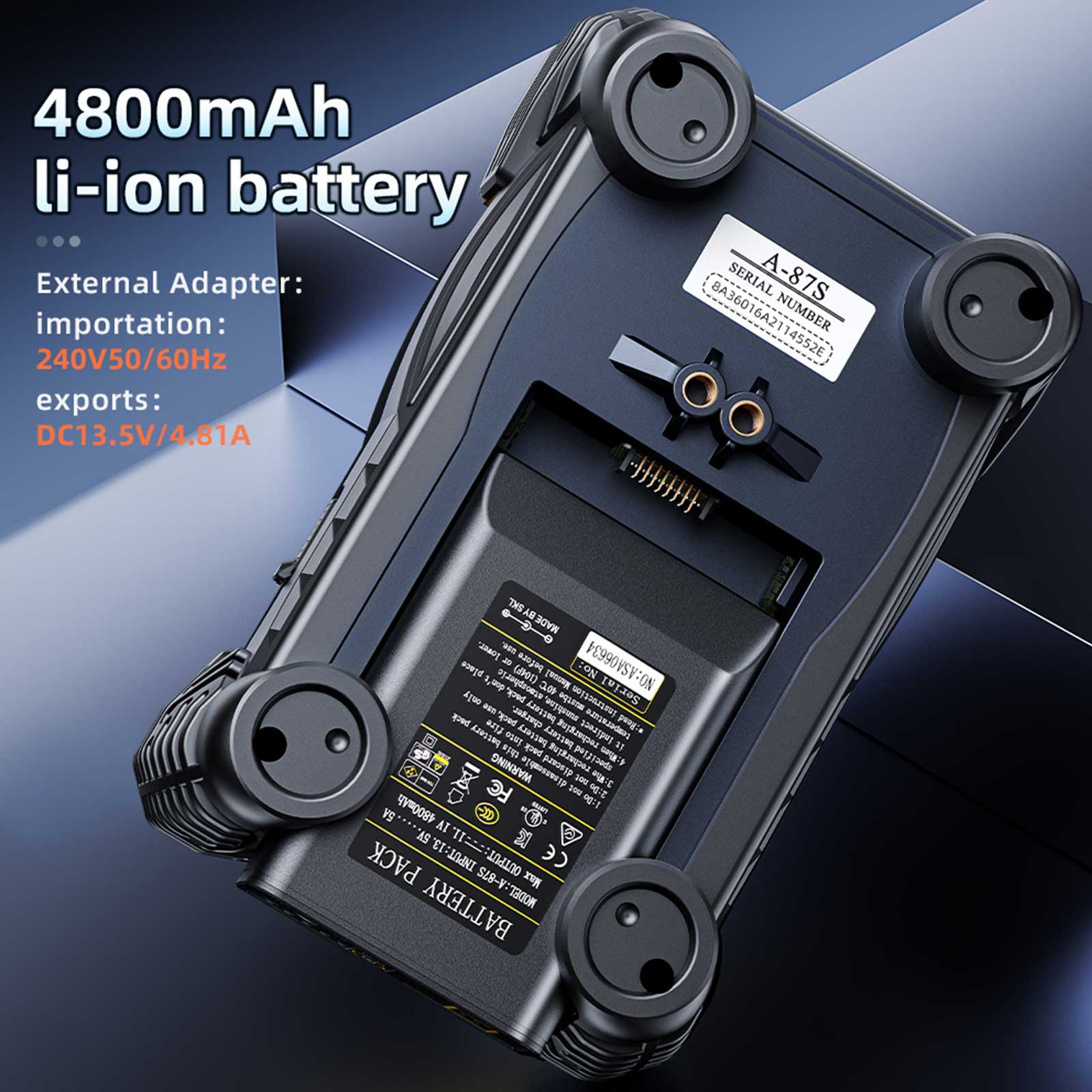 | Power supply | The built-in lithium battery 11.8V supplies the power, charging time ≤ 3.5h; External adapter, input AC100-240V50/60HZ, output DC 13.5V / 4.81A |